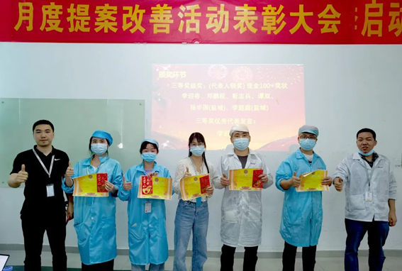 2月份,共收到員工提出141項(xiàng)提案,經(jīng)各評(píng)審小組審核評(píng)選,最終角逐出一等獎(jiǎng)1名,二等獎(jiǎng)3名,三等獎(jiǎng)6名,評(píng)審小組成員分別為優(yōu)秀提案改善項(xiàng)目人員頒發(fā)榮譽(yù)證書、獎(jiǎng)金,并合影留念。
