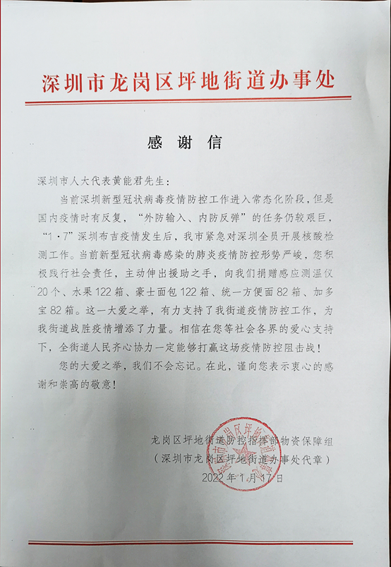 在“0107”新冠疫情發(fā)生以來,作為總部位于深圳市龍崗區(qū)的本土企業(yè),邁騰電子主動踐行社會責任,深圳市人大代表,邁騰電子有限公司總經理黃能君積極參與和支持深圳市疫情防控工作。1月17日,公司向位于深圳市龍崗區(qū)坪地街道坪西社區(qū)捐贈生活物資與防疫物資,為社區(qū)疫情防控盡綿薄之力。