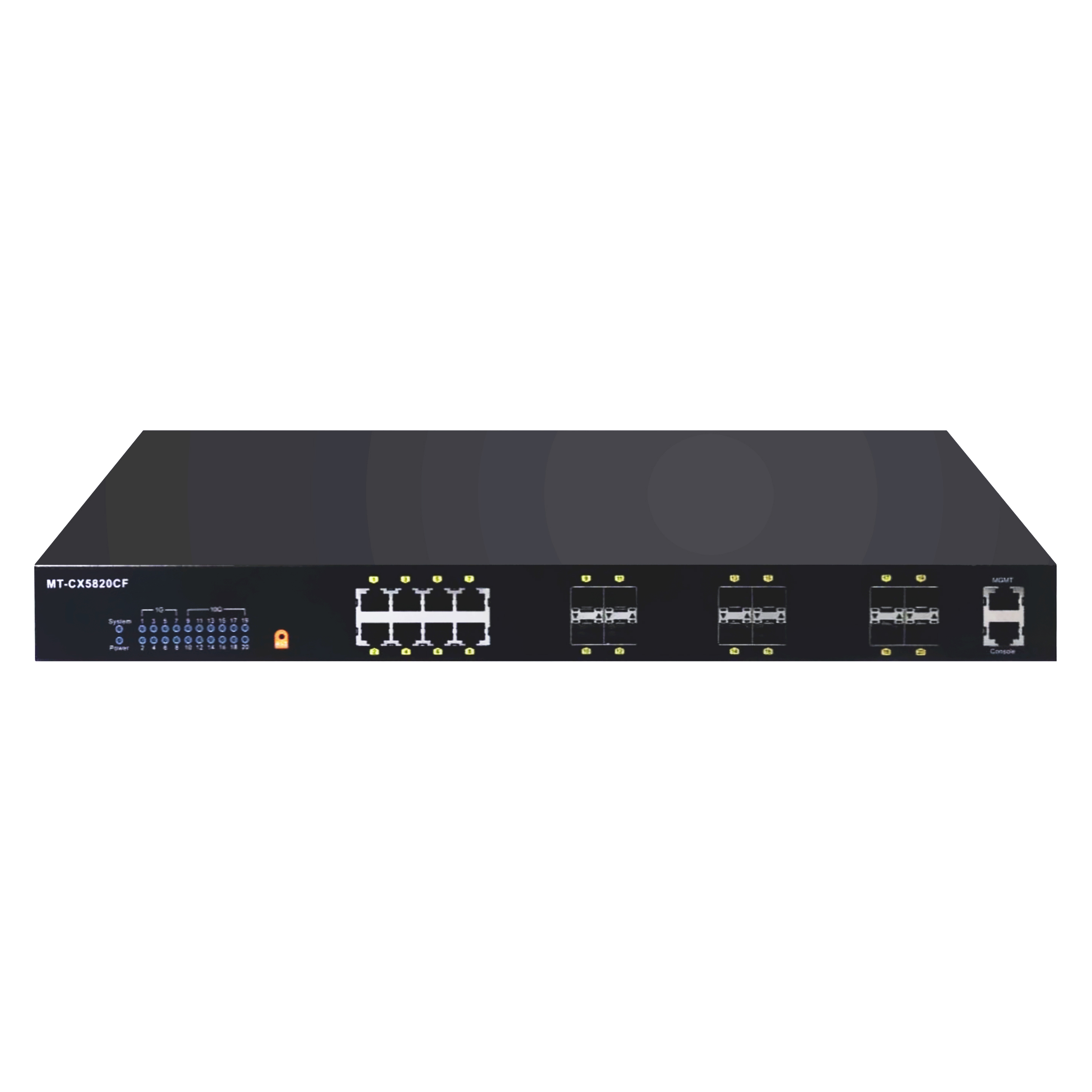 8個 10/100/1000M RJ-45 MDI/MDI-X 自適應端口, 12個萬兆SFP+端口,1 個 Console 口,1個管理端口 |