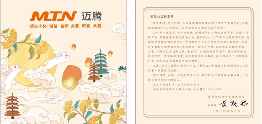 明月寄相思,中秋共團圓。在這個充滿溫情與詩意的傳統(tǒng)佳節(jié)——中秋節(jié)來臨之際,邁騰電子及各子分公司為全體員工精心準備了中秋節(jié)福利,向每一位辛勤付出的員工及其家人送上最誠摯的祝福和問候。