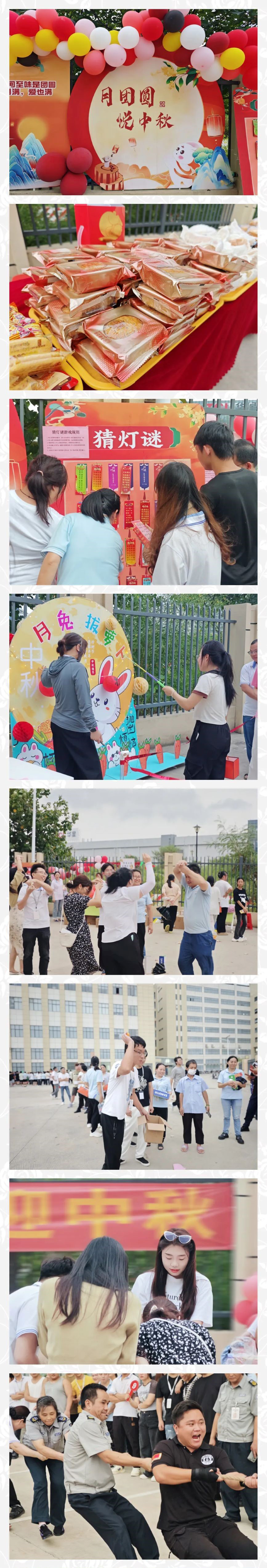 公司總部及華東、華南各地區(qū)行政精心組織了“中秋游園活動”在輕松愉快的游園活動中,各地區(qū)同事們積極參與,享受了各種趣味游戲,猜燈謎、美食廚藝大比拼、拔河比賽等各項活動,現(xiàn)場充滿了歡聲笑語,其樂融融,本次活動讓員工收獲了喜悅與祝福,體驗了傳統(tǒng)節(jié)日的文化魅力,舒緩了緊張的工作情緒,感受到了公司大家庭的溫暖,在節(jié)日來臨之際留下了獨特而美好的記憶。